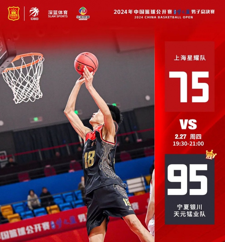 上半場,兩隊打得相對膠著,比分緊咬。首節(jié)戰(zhàn)至19-18,上海星耀領先一分。次節(jié)28平后,上海星耀24號劉暢連續(xù)命中三分,21號高文浩兩分再打中,12號周顧軒1投1罰得3分,上海星耀打出一波得分小高潮。隨后寧夏天元錳業(yè)奮起直追,上半場結(jié)束,上海星耀47-42領先寧夏天元錳業(yè)。下半場,8號于思洋、29號于哲扛起寧夏天元錳業(yè)進攻大旗,在第三節(jié)實現(xiàn)反超。末節(jié),上海星耀手感欠佳,寧夏天元錳業(yè)在外線多次投中,繼續(xù)擴大領先優(yōu)勢,最終上海星耀75-95不敵寧夏天元錳業(yè)。