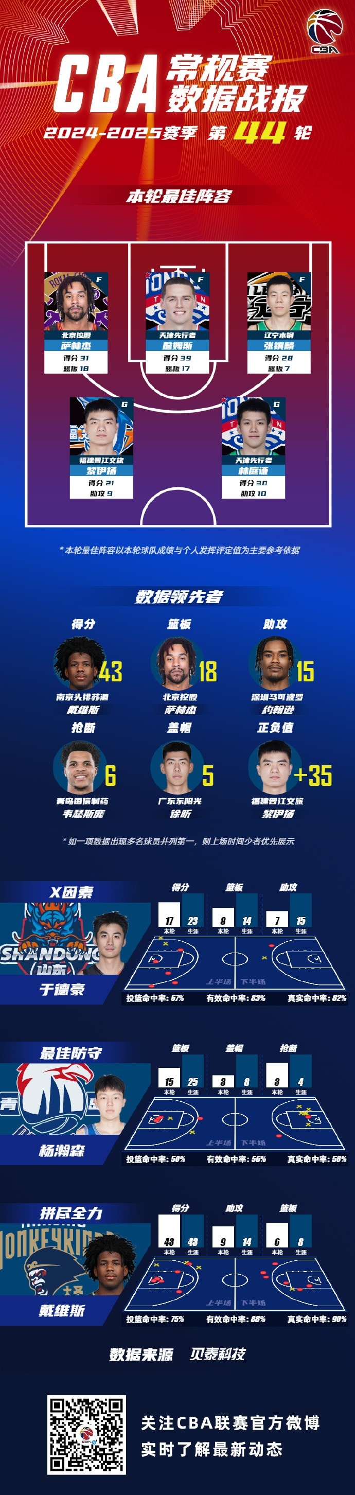 數(shù)據(jù)領先者方面:南京同曦籃球俱樂部球員戴維斯以單場43分的數(shù)據(jù)領銜得分榜;