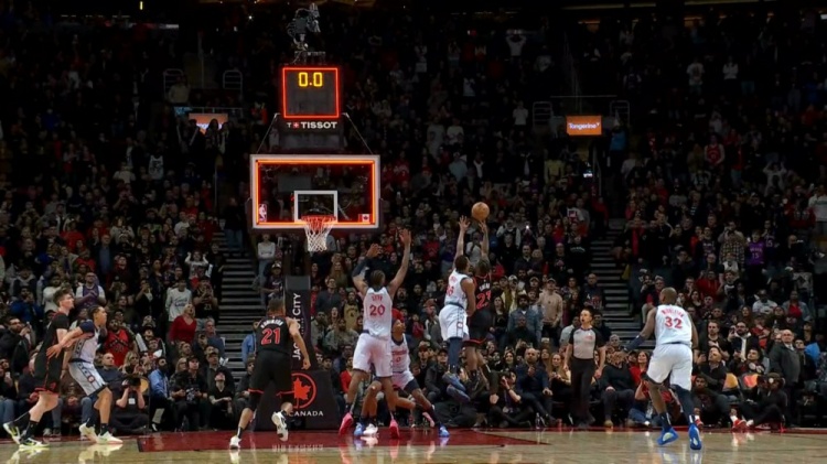 奇才隊(duì)垂頭喪氣地站在一旁,希望裁判的審查能取消這個(gè)進(jìn)球。當(dāng)裁判做出裁決——謝德在時(shí)鐘指向0:00時(shí)仍有兩個(gè)手指觸球——奇才隊(duì)高興地跳了起來,猛龍隊(duì)從興奮變?yōu)檎痼@,噪音從喧鬧變?yōu)槔Щ蟮牡驼Z(yǔ)。