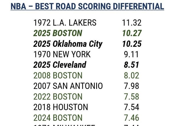 據(jù)統(tǒng)計(jì),本場(chǎng)比賽過(guò)后,凱爾特人的賽季場(chǎng)均客場(chǎng)凈勝分來(lái)到10.27,超越本賽季的雷霆(10.25),升至歷史第二位,僅次于1972年的湖人。