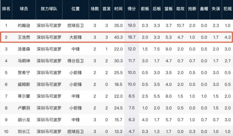 戲份增加的王浩然,產(chǎn)量也無愧于教練組的信任——他場均18.7分僅次于小外援約翰遜的19分,作為本土隊(duì)內(nèi)得分王的同時(shí),另外也有隊(duì)內(nèi)第4的5.3籃板,和第2的4.7次助攻。