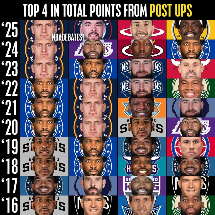 NBA近10賽季背身單打得分榜:恩比德&約基奇3連霸 祖巴茨申京崛起