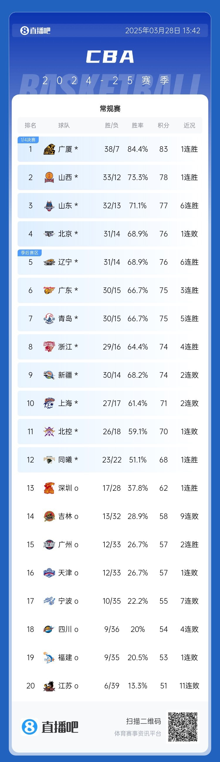 3月28日訊 本賽季常規(guī)賽第45輪昨晚已經(jīng)全部結束,本輪比賽過后,本賽季的排名形勢進一步明朗。