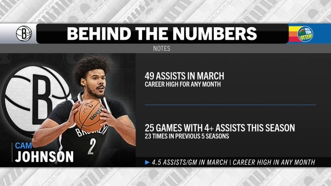 轉(zhuǎn)播方曬出一組數(shù)據(jù),籃網(wǎng)球員卡梅隆-約翰遜在3月已送出49次助攻、場均4.5次,這2項數(shù)據(jù)是他個人生涯的單月新高。