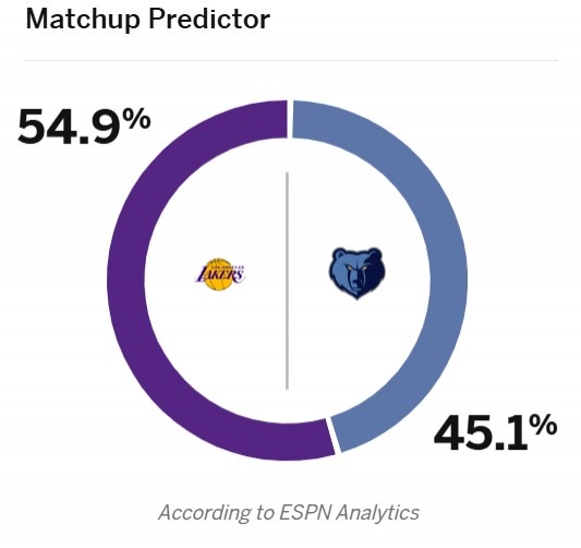 今天,ESPN預測本場比賽勝率,湖人54.9%,灰熊45.1%。