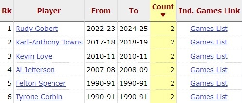 - 戈貝爾今天25板&10前場板 森林狼生涯第3次前場板上雙 隊史最多