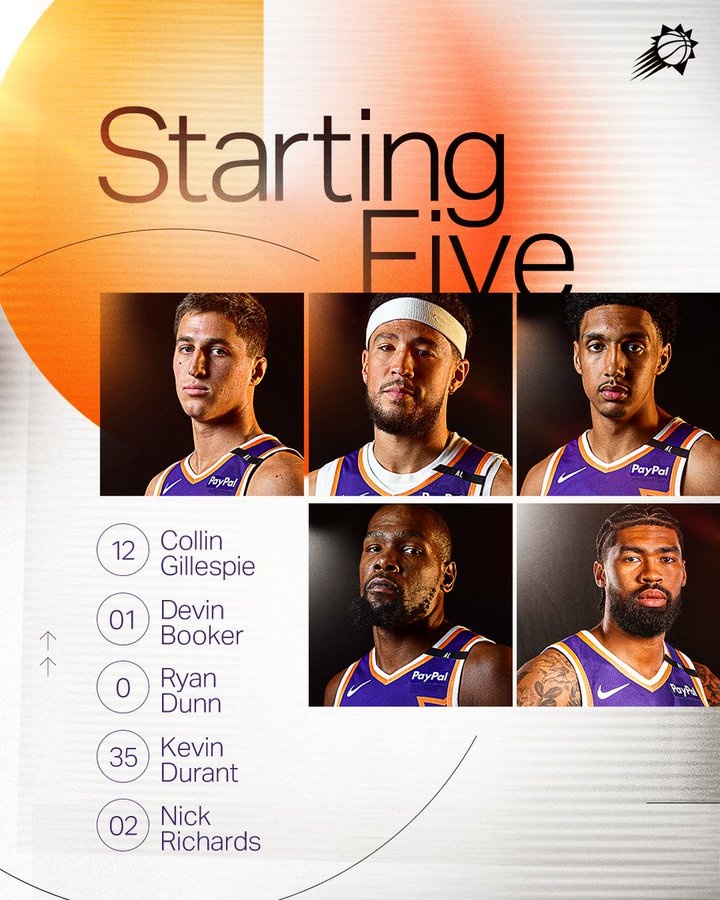 賽前太陽公布了本場(chǎng)首發(fā)陣容:吉萊斯皮、布克、瑞安-鄧恩、杜蘭特和理查茲。