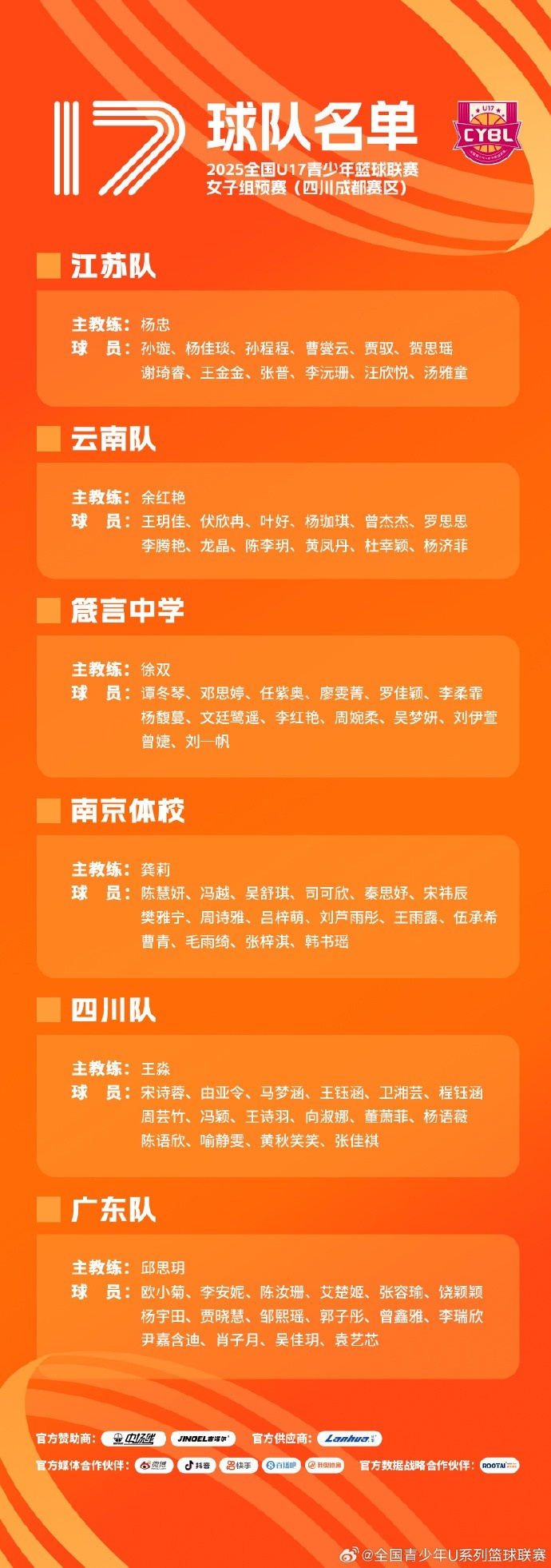 4月7日-13日,2025全國U17青少年籃球聯(lián)賽女子組預賽將分別在四川成都賽區(qū)和河北秦皇島賽區(qū)同時進行,參賽隊伍、運動員名單如下: