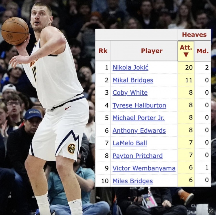 本賽季后場三分投籃:約基奇20中2 大橋11中0 文班亞馬6中1