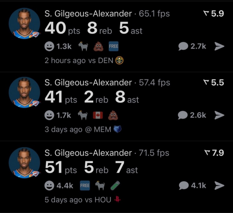 這樣以來,亞歷山大已經連續(xù)3場比賽砍下40+,雷霆隊史繼威少后第二人!