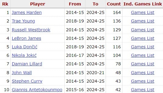 哈登過去10年里165場(chǎng)比賽至少25分10助 同期所有球員中最多