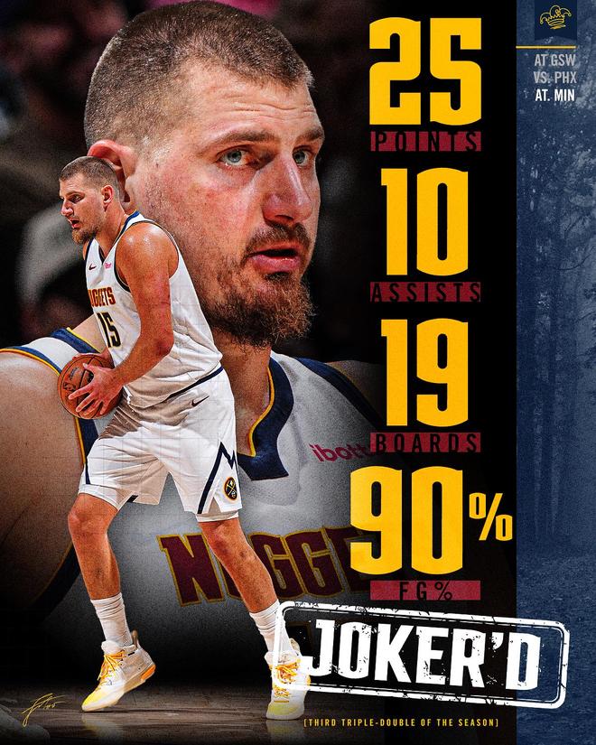 核心約基奇延續(xù)神奇表現(xiàn),全場10投9中,高效砍下25分19籃板10助攻2搶斷1蓋帽三雙數(shù)據(jù),開季至今連續(xù)第三場交出三雙表現(xiàn)。