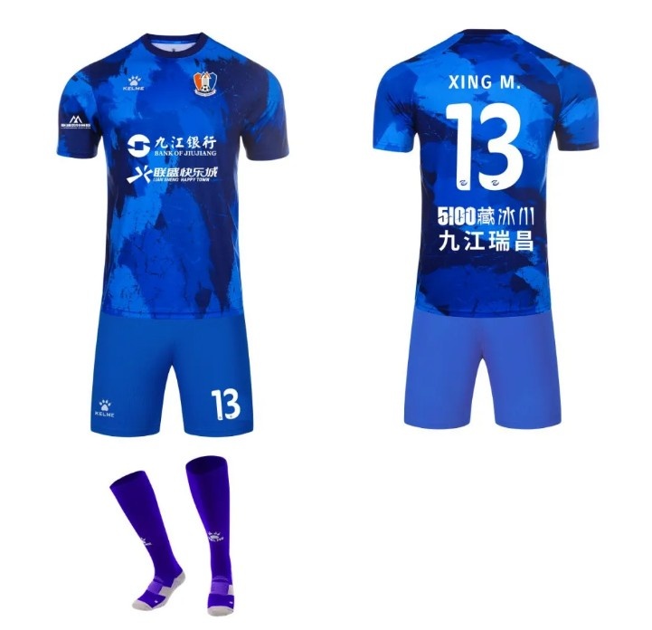 第一客場戰(zhàn)袍采用沉穩(wěn)大氣的深藍(lán)色,彰顯球隊沉穩(wěn)冷靜、從容不迫的氣質(zhì)。以浩瀚星空為靈感,將深邃的藍(lán)色作為主色調(diào),象征著江西廬山足球俱樂部胸懷遠(yuǎn)大理想,在綠茵場上追逐夢想,永不言棄的精神。