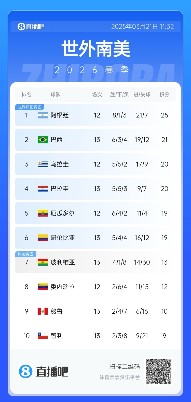- 南美積分榜:阿根廷領(lǐng)跑&已晉級世界杯,巴西降至第四!