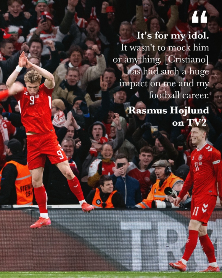 3月21日訊 歐國聯(lián)1/4決賽首回合中,丹麥1-0擊敗葡萄牙,霍伊倫破門后模仿了C羅標(biāo)志性的Siu慶祝動(dòng)作。