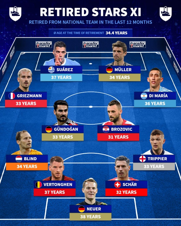 3月23日訊 德國轉(zhuǎn)會市場列出了近一年從國家隊退役的球星陣容,蘇亞雷斯、穆勒、格列茲曼、迪馬利亞、諾伊爾在列。