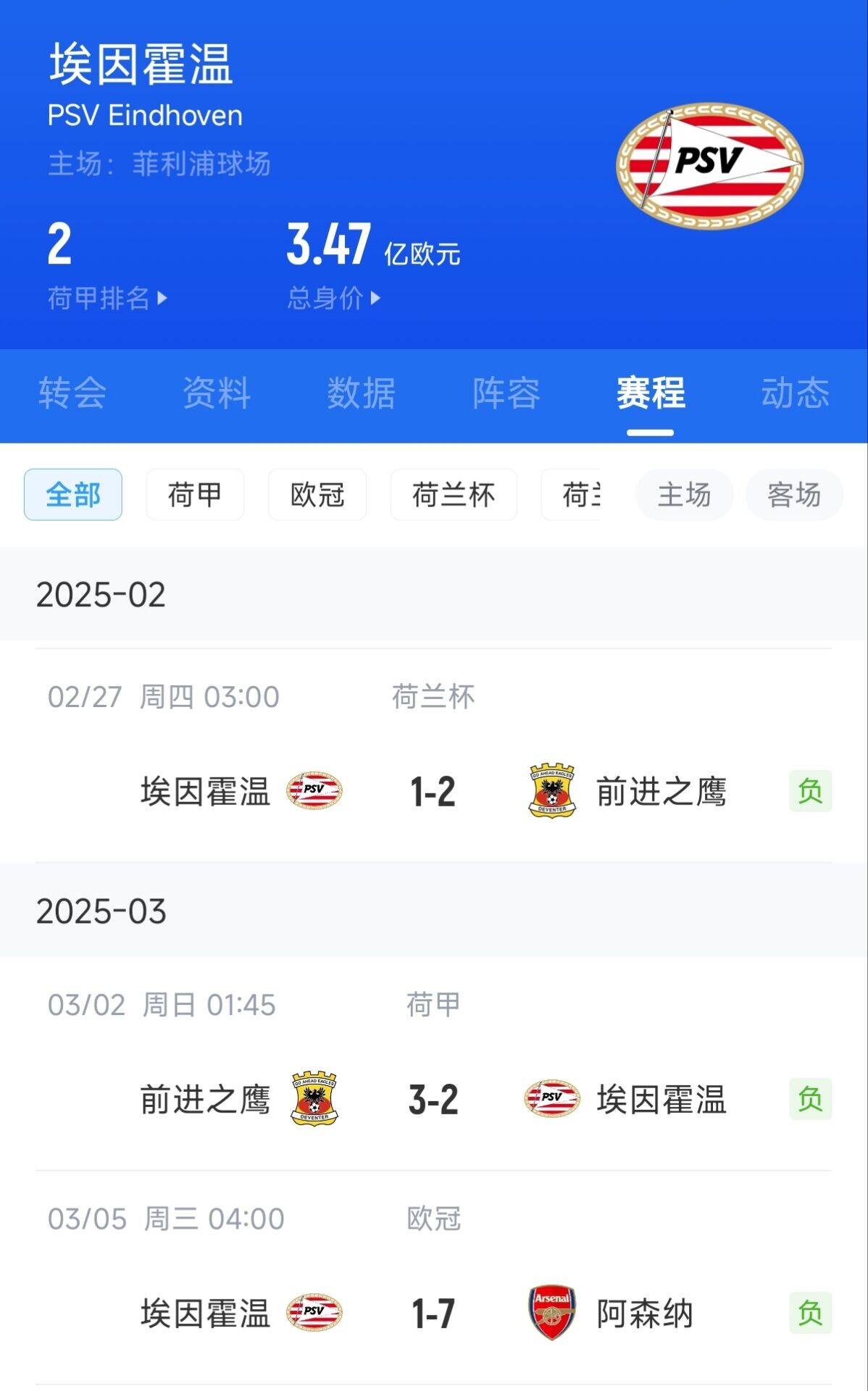 6天前的2月27日,埃因霍溫荷蘭杯半決賽1-2不敵前進(jìn)之鷹,無(wú)緣決賽。3天前的荷甲聯(lián)賽,埃因霍溫2-3被前進(jìn)之鷹雙殺,荷甲再丟3分,距離榜首阿賈克斯已有8分差距。今天凌晨,埃因霍溫歐冠遭遇慘敗,出局幾乎板上釘釘。
