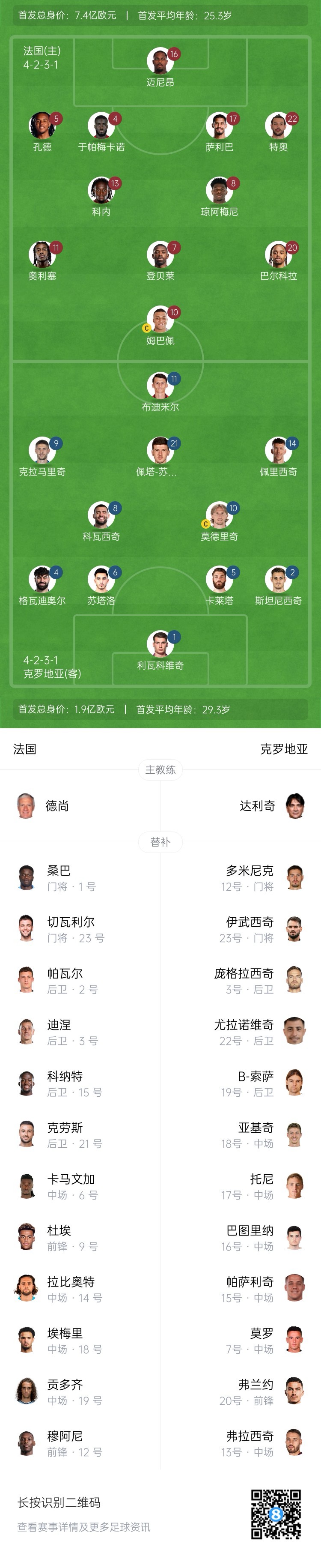 法國替補(bǔ):1-桑巴、23-切瓦利爾、2-帕瓦爾、3-迪涅、6-卡馬文加、9-杜埃、12-穆阿尼、14-拉比奧特、15-科納特、18-埃梅里、19-貢多齊、21-克勞斯