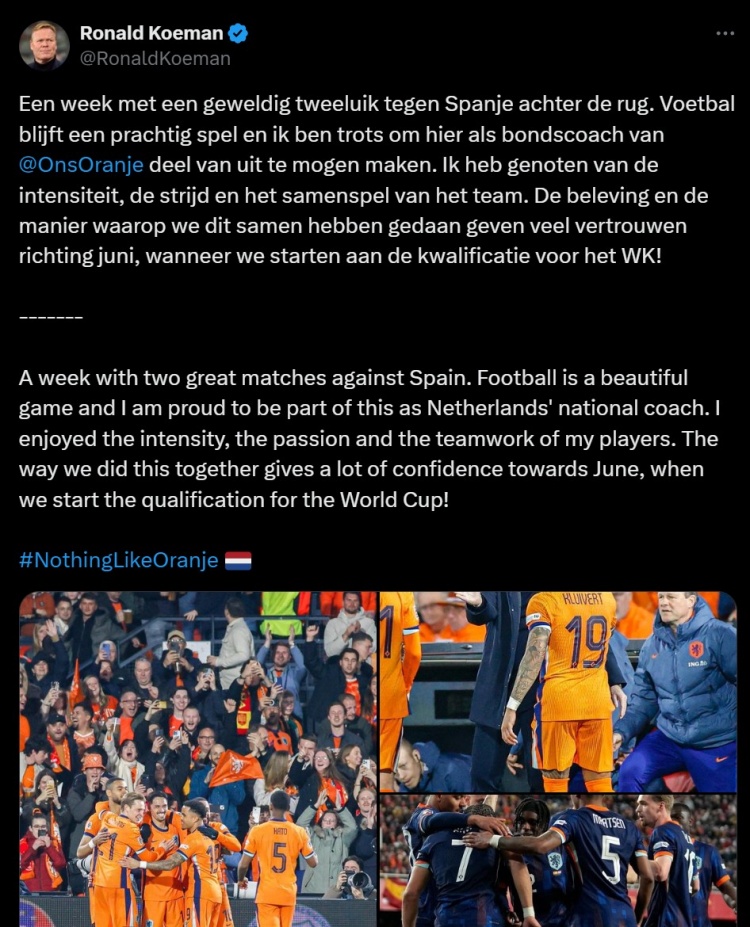 3月25日訊 荷蘭在歐國(guó)聯(lián)八強(qiáng)戰(zhàn)經(jīng)歷點(diǎn)球大戰(zhàn)不敵西班牙,主帥科曼在今日通過(guò)社媒發(fā)文。