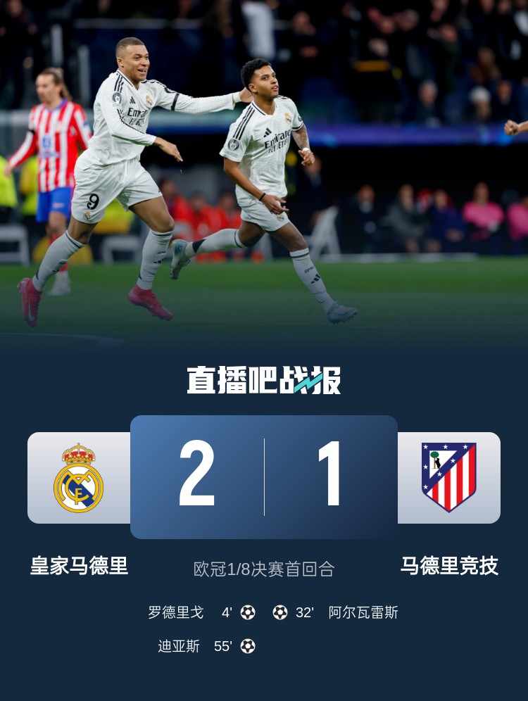 歐冠1/8決賽首回合,皇馬2-1馬競(jìng),占據(jù)晉級(jí)先機(jī)。上半場(chǎng),巴爾韋德助攻羅德里戈內(nèi)切擺脫防守破門(mén),阿爾瓦雷斯過(guò)掉卡馬文加后世界波扳平;下半場(chǎng),卜拉欣-迪亞斯禁區(qū)內(nèi)蝴蝶穿花步過(guò)人后建功。