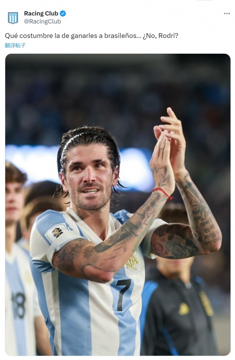 阿根廷競技俱樂部社媒曬出自家青訓國腳德保羅的照片,并寫道:“擊敗巴西人真是成習慣了,對吧,德保羅?”