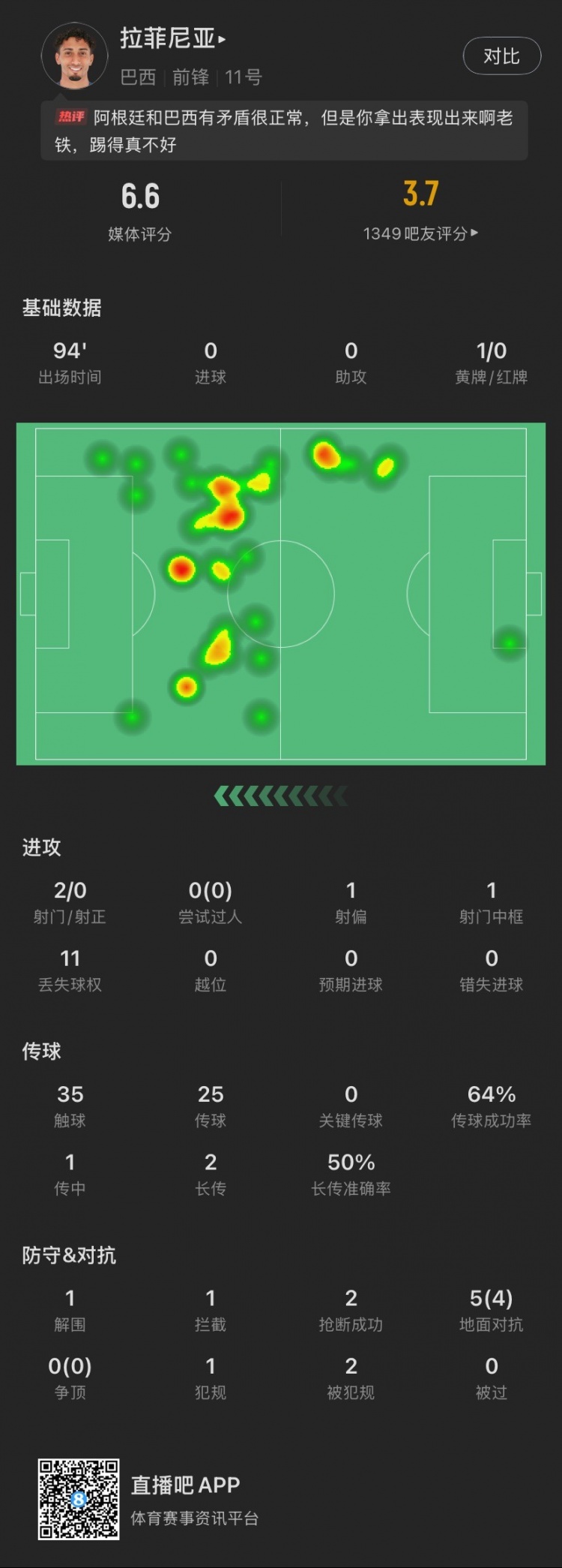 - 白放狠話了?拉菲尼亞本場:2射0正1中框,1黃牌,5次對抗成功4次