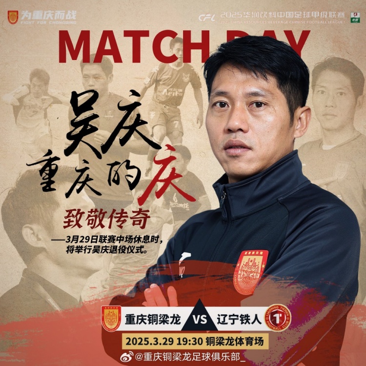 - 重慶銅梁龍官方:對(duì)陣遼寧鐵人中場(chǎng)休息時(shí)將舉行吳慶退役儀式