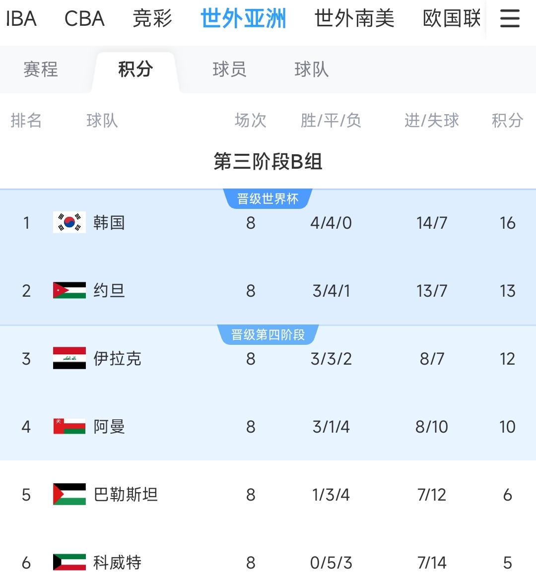 18強(qiáng)賽B組積分榜上,巴勒斯坦積6分排名小組第5,依然存在小組前四晉級附加賽的希望。在18強(qiáng)賽前8輪比賽中,巴勒斯坦取得1勝3平4負(fù),其中兩回合交手韓國隊(duì)均取得平局。