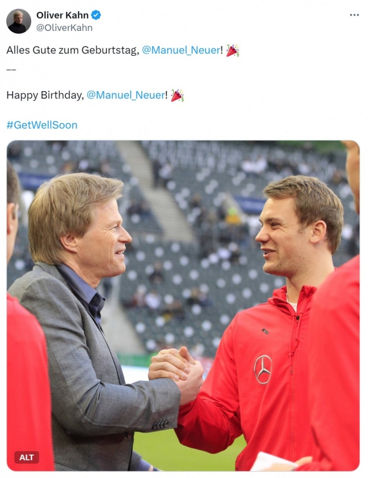 卡恩社媒曬出與諾伊爾的合照,配文:“生日快樂,諾伊爾!”