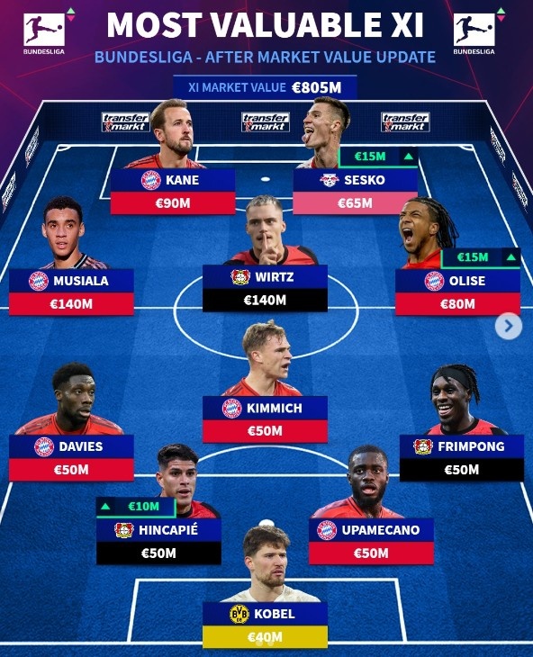3月27日訊 德國轉(zhuǎn)會(huì)市場(chǎng)公布了德甲最貴陣,凱恩領(lǐng)銜的拜仁6將入選,維爾茨、塞斯科在列。