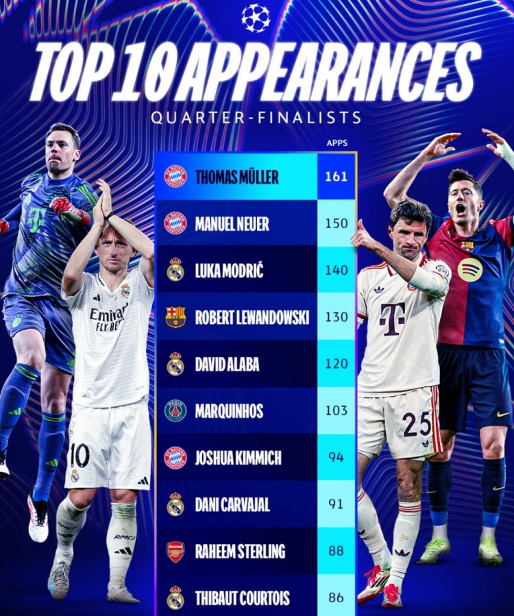 歐冠8強(qiáng)球員賽事出戰(zhàn)場(chǎng)次top10:穆勒161場(chǎng)居首,諾伊爾150場(chǎng)次之