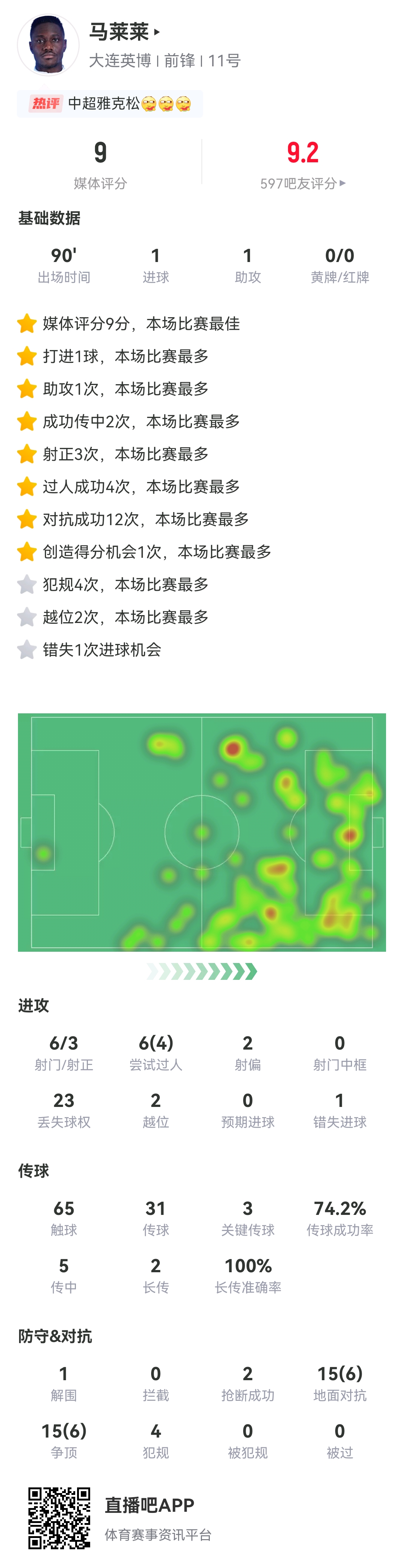 本場比賽馬萊萊在前場表現(xiàn)出色,多項(xiàng)數(shù)據(jù)本場比賽最佳。但同時,馬萊萊也有打丟單刀,甚至是失空門的表現(xiàn)。