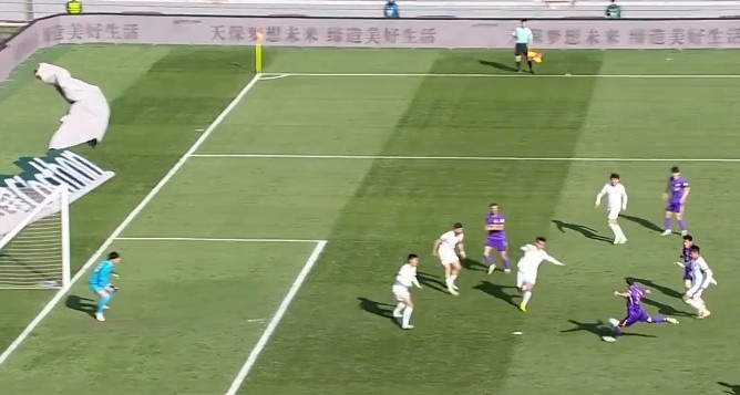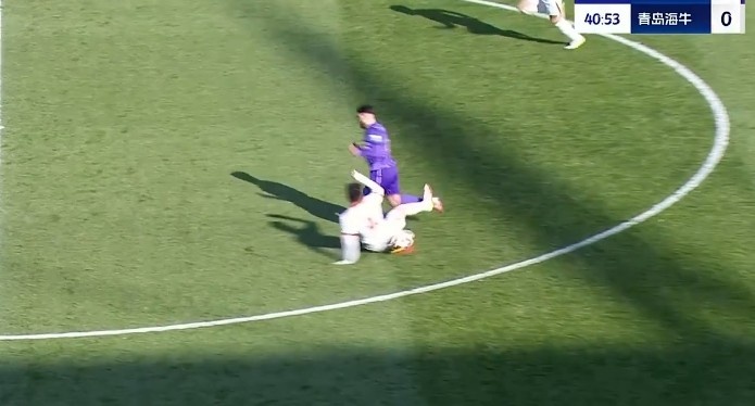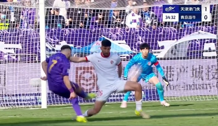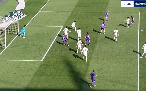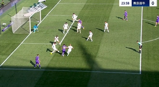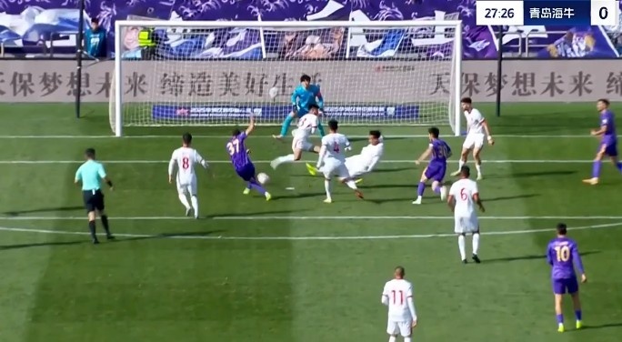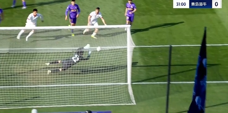 第31分鐘,青島海牛禁區(qū)里一次頭球攻門被門將飛身撲出底線。↓