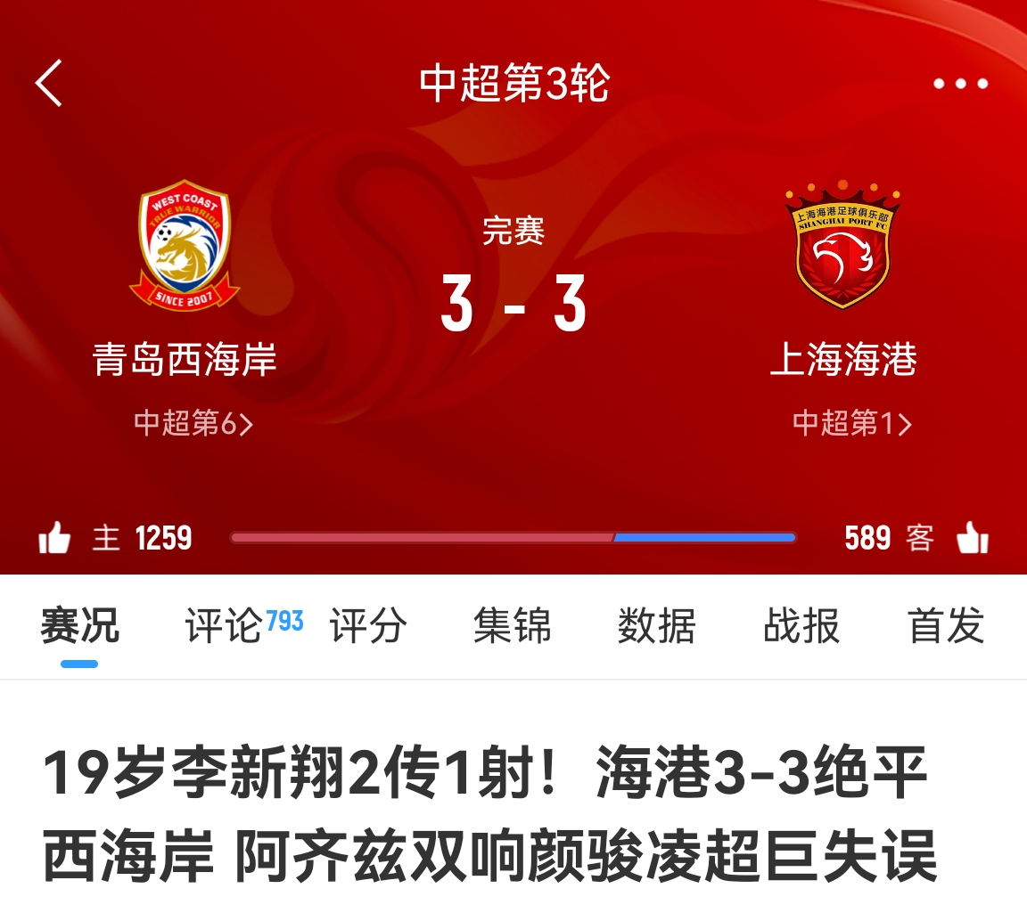 19歲李新翔橫空出世,助海港3-3絕平西海岸