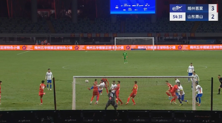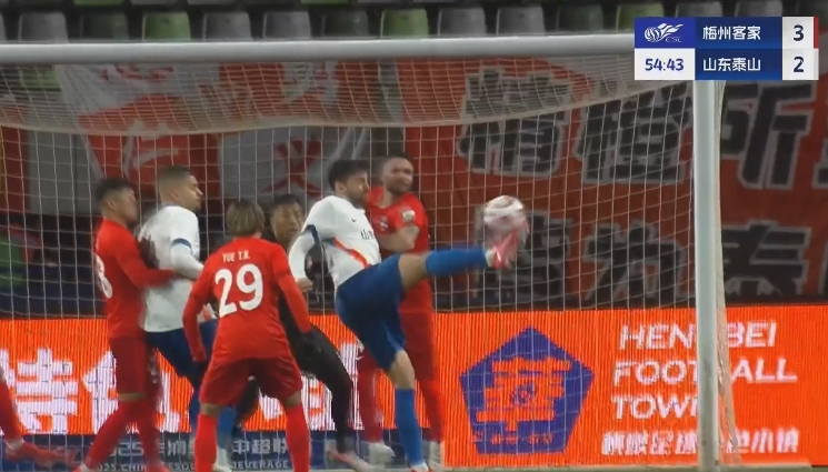 03月29日訊 泰山vs梅州第55分鐘,泰山角球機(jī)會(huì),澤卡倚人勾射破門,泰山再扳一球2-3落后梅州!