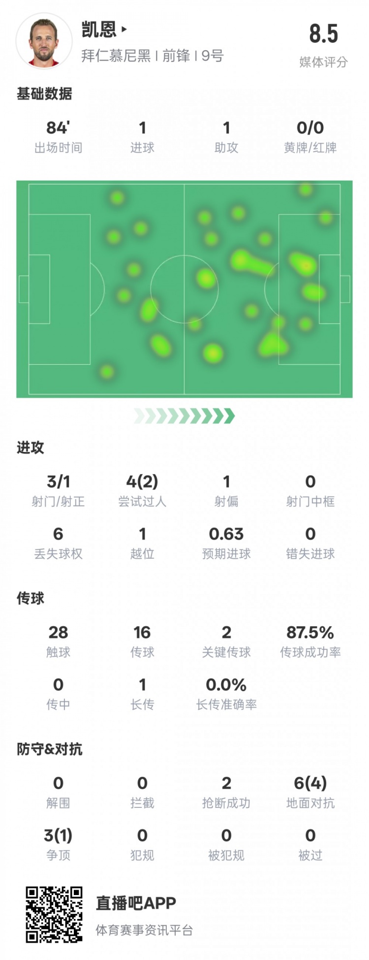 凱恩本場數(shù)據(jù):傳射建功&2關(guān)鍵傳球2過人成功,評分8.5