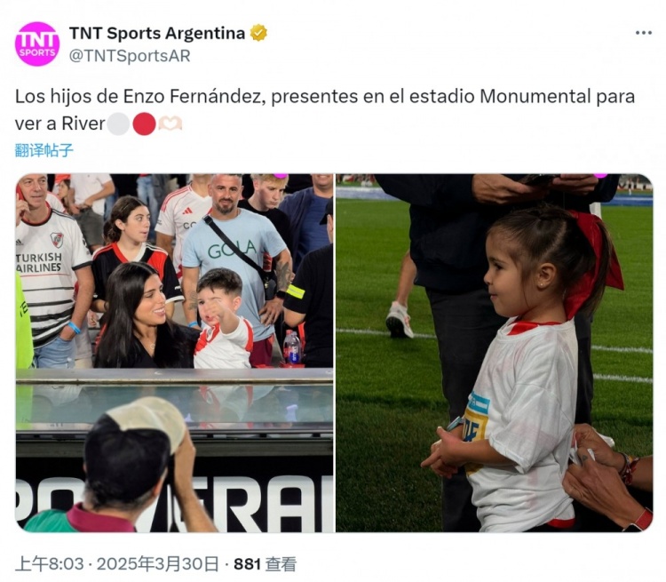 - 恩佐女友帶著孩子來到紀(jì)念碑球場,現(xiàn)場觀看恩佐母隊(duì)河床比賽