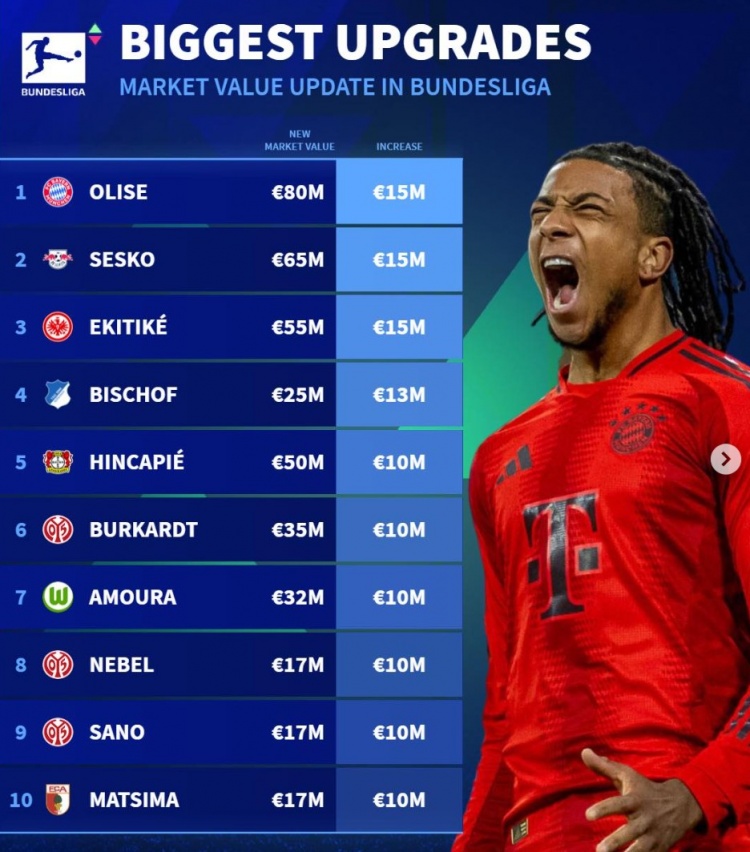 - 德轉(zhuǎn)列身價(jià)更新后德甲升值榜:奧利塞&塞斯科&?;倏藵q1500萬歐