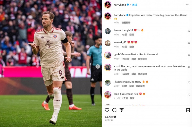 3月30日訊 拜仁在本輪德甲3-2險(xiǎn)勝圣保利,凱恩傳射建功也在賽后通過(guò)社媒曬照慶祝。