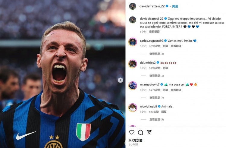 弗拉泰西也在賽后通過(guò)社媒曬出自己的怒吼慶祝照,并配文:“今天(的勝利)太重要了……如果我有時(shí)踢得不太好,我對(duì)此非常抱歉。但那些了解我的人都清楚發(fā)生了什么。加油,國(guó)際米蘭!”