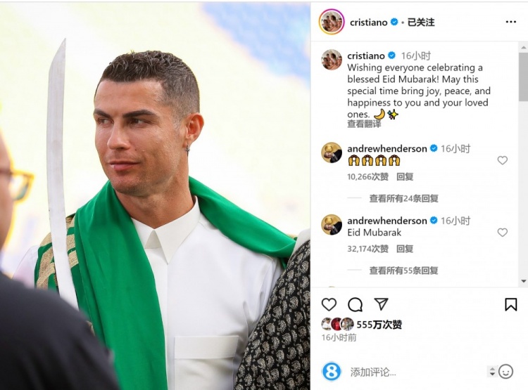 C羅社媒送開齋節(jié)祝福:愿這個(gè)日子給大家?guī)硐矏偂矊幣c幸福