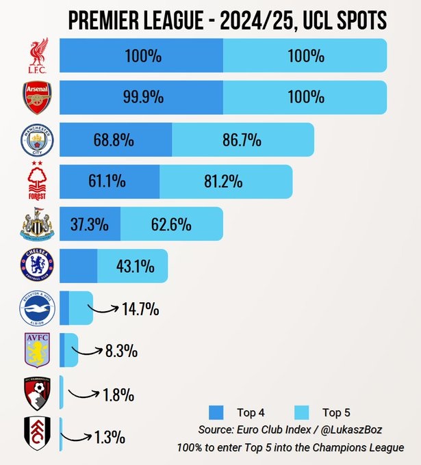 下賽季,英超前五將獲得歐冠資格,以下為2024-25賽季英超球隊前四/前五概率: