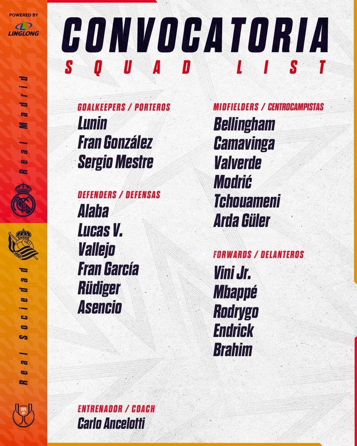 3月31日訊 北京時(shí)間4月2日周三凌晨3點(diǎn)30分,皇家馬德里將在國(guó)王杯半決賽次回合主場(chǎng)對(duì)陣皇家社會(huì),首回合皇馬1-0取勝,今天皇馬公布了次回合比賽日名單,具體如下: