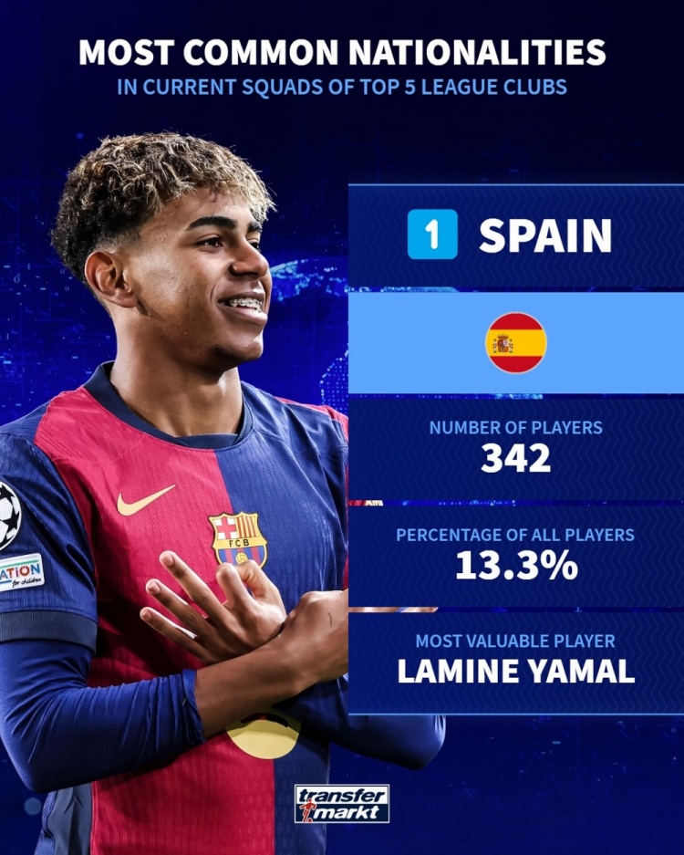 - 五大聯(lián)賽各國(guó)球員數(shù)量排名:西班牙342人最多,法國(guó)、德國(guó)二三位