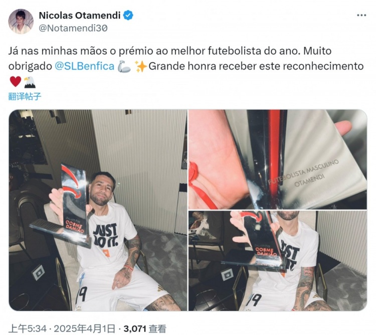 - 37歲奧塔門迪當(dāng)選本菲卡年度最佳球員,社媒曬手拿獎杯照片