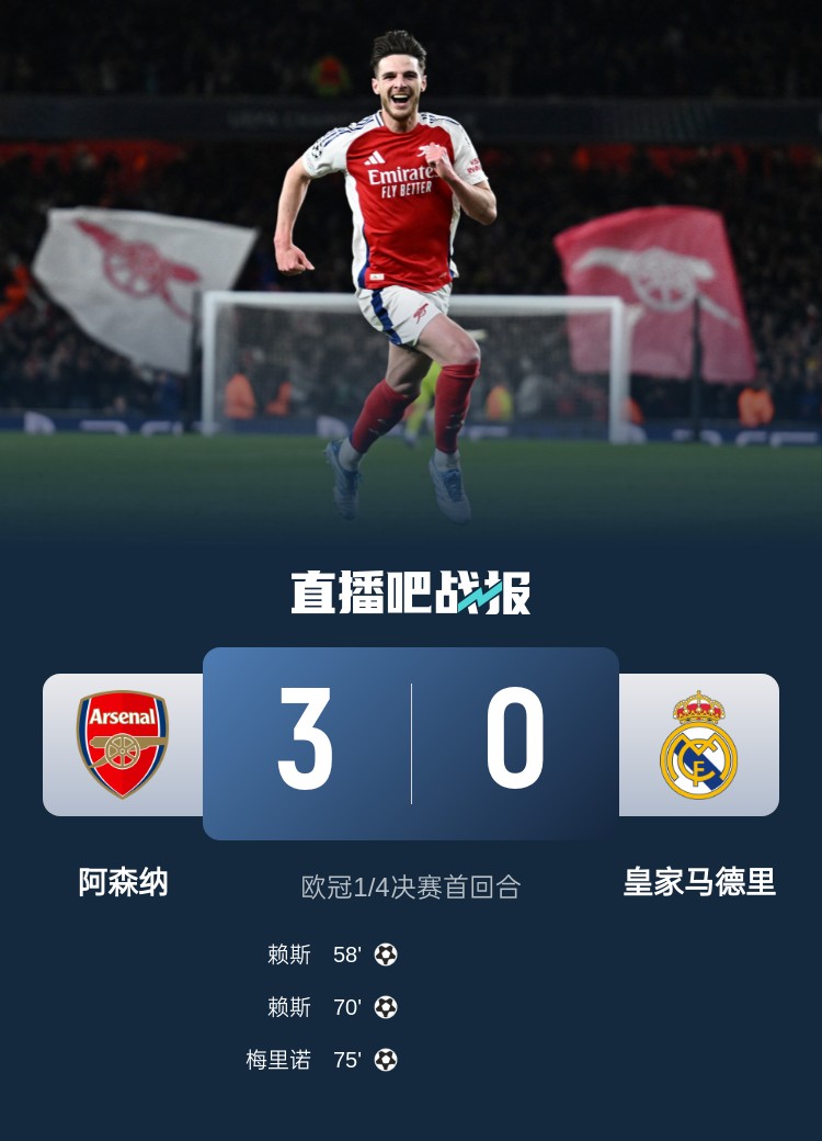 - 實(shí)至名歸!賴斯被票選為阿森納3-0皇馬的隊(duì)內(nèi)最佳球員