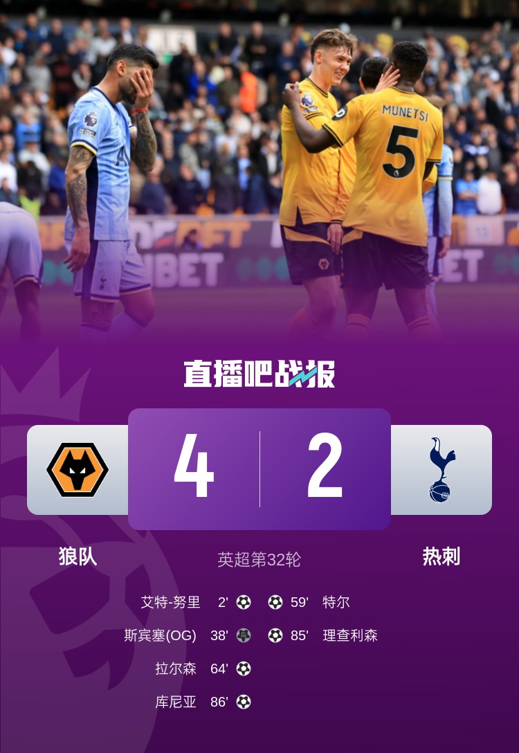 熱刺2-4不敵狼隊,近6輪4負的同時,送給狼隊英超4連勝。
