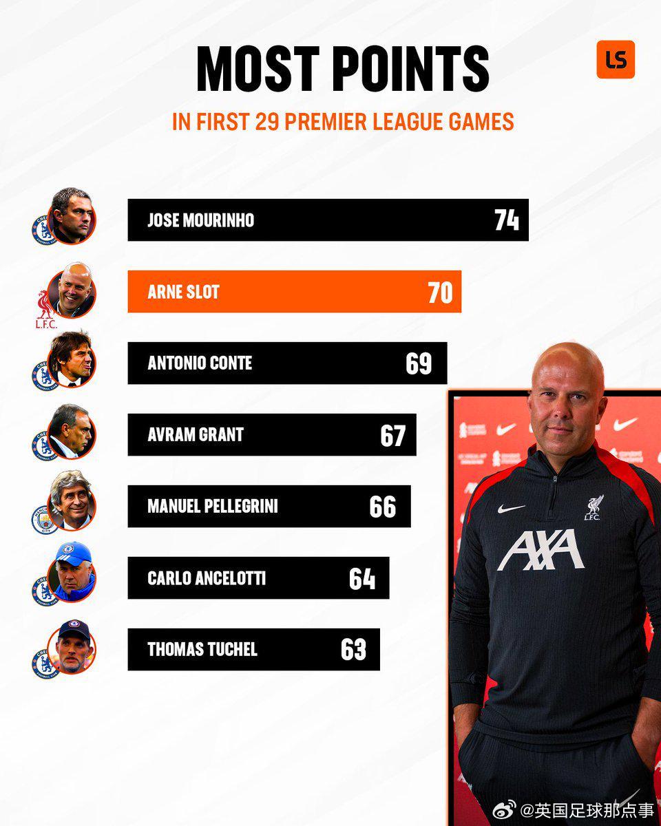 英超主帥前29場(chǎng)積分:穆帥74分第1,斯洛特70分第2,藍(lán)軍主帥霸榜
