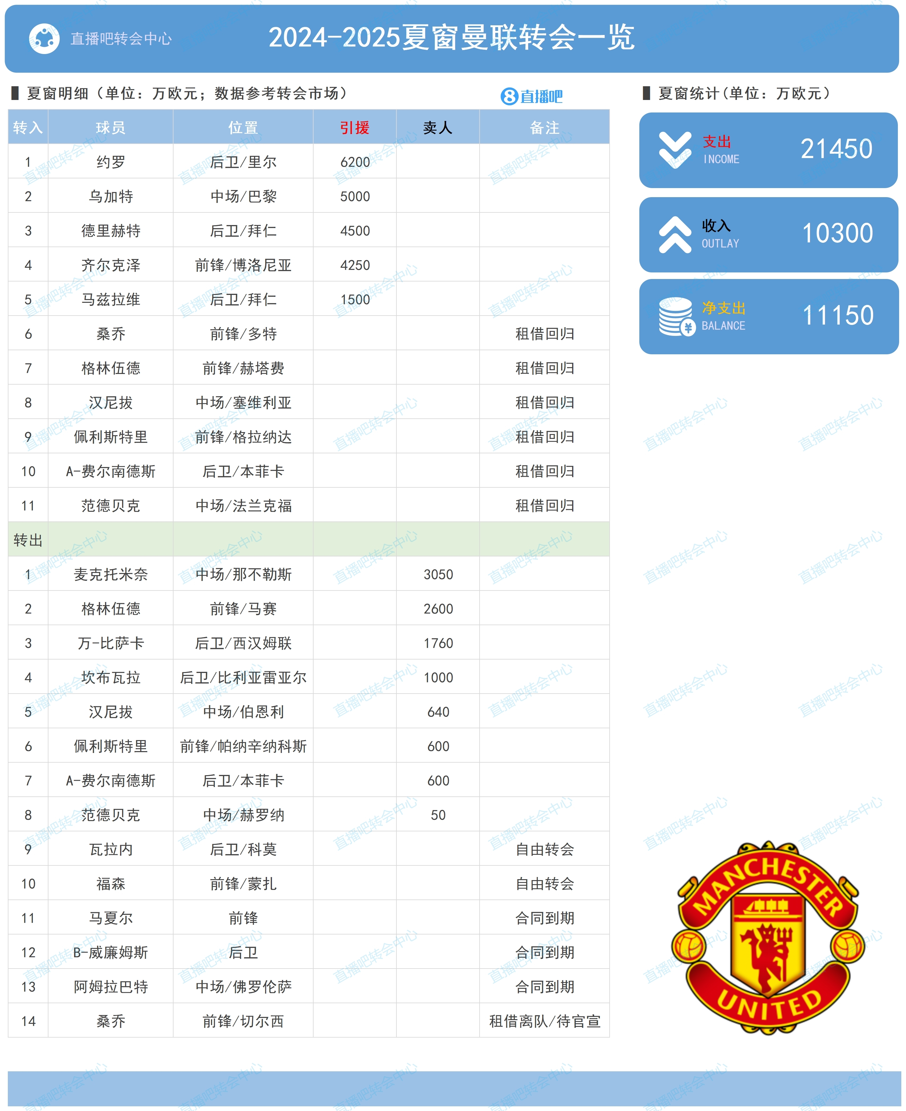 曼聯(lián)去年夏天引援如圖,荷蘭球員有德里赫特(4500萬歐)和齊爾克澤(4250萬歐)。
