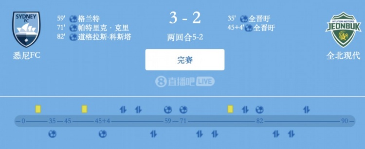 比賽最后階段,道格拉斯-科斯塔點球破門,最終悉尼FC主場3-2擊敗全北現(xiàn)代,總比分5-2晉級四強。